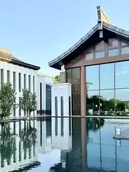 The tree-lined avenue leading to the hotel instantly isolates guests from outside noise, marking the beginning of the "secluded" experience. The entrance features a minimalist white wall and podocarpus trees as natural screens, while the lobby's floor-to-ceiling windows frame a landscape pool with glass boats that seamlessly connects to Tianmu Lake. The symmetrical layout of sofas and furnishings in the lobby lounge complements this breathtaking view. The outdoor infinity pool faces the lake, with bridges and pavilions extending over the water, serving both as docks and perfect panoramic viewing platforms. A stroll around the island reveals a courtyard where flowing water empties into a well, creating picturesque scenery.