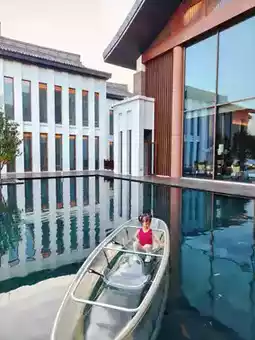 We chose to hide in the embrace of Tianmu Lake, feeling the summer breeze. The hotel is surrounded by mountains and water, peaceful and relaxing! Upon entering, you can see the grand "Ji" character lobby with a strongly designed curved roof. The kids love the infinity pool here, where they can freely play on transparent boats. The pool and lake view blend seamlessly. Additionally, the hotel offers bicycles 🚲 for riding through the bamboo forest.