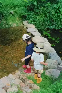 In summer, kids can enjoy not only the creek but also trampolines, swings, and climbing nets