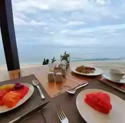 A walking path through manicured green lawns leads to the open-air reception pavilion, draped with flowing vines from its low-slung rooftop. Inside, cocoa-brown rattan sofas and teak furniture provide a neutral backdrop to a corner gallery that pops with colorful local artwork. In an adjacent pavilion, a casual bar with contemporary platform sofas opens to expansive views of the ocean and the long infinity pool, which is surrounded by handsome teak decking and cushioned sun beds. The same gorgeous view is shared by the open-air restaurant on the pool's other end, where guests sip morning coffee on a terrace perched on the white sand. The vast majority of guests here are international couples seeking a quiet beach vacation.