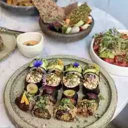 Gorgeous new vegan spot alert 🌿 @holycarrotrestaurant located @urban_retreat combines delicious vegan food with the dreamiest decor 🥰🤍 I was really impressed with the menu which showcased a mix of Asian & British dishes ☺️ absolutely loved this maki set & the sexy tofu 🍣 they use cauliflower rice instead of sushi rice which I thought was really clever & made the dish lighter on the stomach 👌🏼 the tofu was crispy with a sticky sauce which was really addictive - one to try even if you don’t like tofu as it might convert you 😉 #prinvite