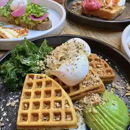 🧇 Nue Ground @nueground - new Aussie brunch spot with savoury waffles & brioche with poached rhubarb 🧡⠀