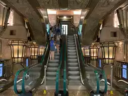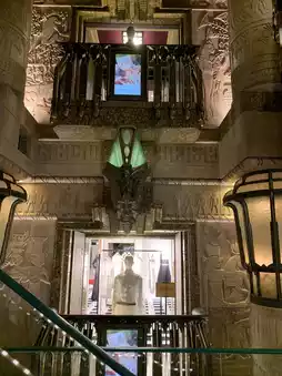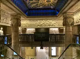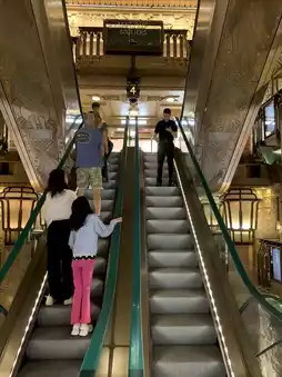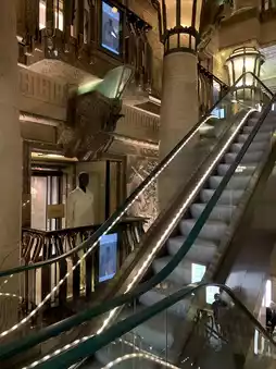 Ride the escalator. The escalators and walls are the most distinctive spaces, as the first owner was Egyptian, so the decor is in ancient Egyptian style. Each floor has a different design, and every detail, such as the windows, gives a strong visual impression.