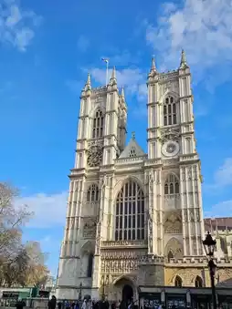 On that rare sunny day in London, Westminster Abbey revealed a completely different aspect compared to its usual rainy days. The blue sky highlighted the church's gray and white Gothic spires, resembling an eternal lighthouse guiding everyone who steps onto this land.