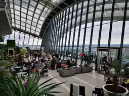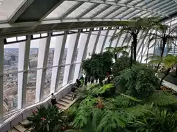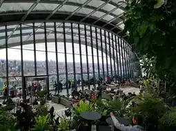 After a quick security check, the elevator ride whisked me up to the 35th floor. The doors opened to a lush indoor garden — tropical plants framing floor-to-ceiling windows that look out over landmarks like the Shard, Tower Bridge, and the Thames.