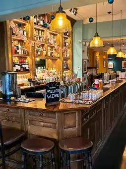 This is a good size pub that is set out in an ‘L’ shape and has a modern contemporary feel. The servery is clad in solid wood panels and is illuminated by classy pendants. The front area of the pub has an eclectic mix of comfy seating and a roaring fireplace, at rear is an area set aside for dining. The walls are painted bold colours and are adorned with a collection of pop art prints. Around the front of the pub are several benches and parasols for the warmer months.
