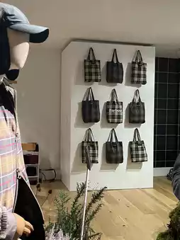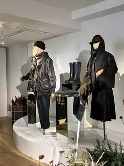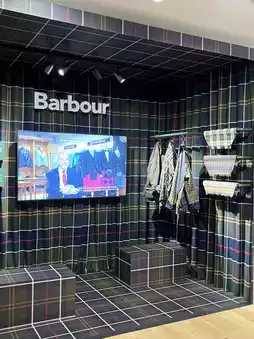 The exhibition features classic Barbour products, including clothing, shoes, and bags. It is also decorated with flowers and green plants to create a welcoming and vibrant atmosphere.
