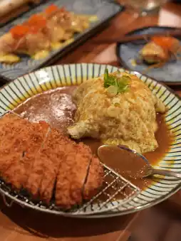 The curry omurice came with a crispy fried chicken cutlet — not too fatty, and paired perfectly with rice and curry. Super flavorful.
