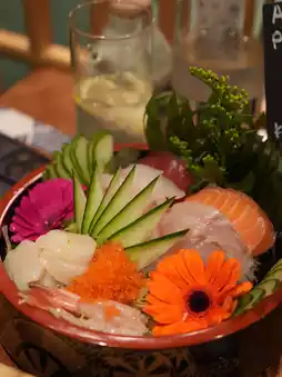 The sashimi platter featured incredibly fresh fish — the scallops and salmon were tender and smooth, and the wasabi was finely grated.