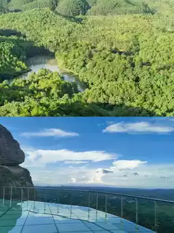 Huoshan is truly a huge surprise! It is an overlooked famous mountain in Guangdong, with magic carpets, glass bridges, and a 360-degree panoramic view that is spectacular and deserves widespread promotion. Lingshan Temple reminds me of the Hanging Temple, similarly situated halfway up the mountain, with the continuous sound of cicadas.