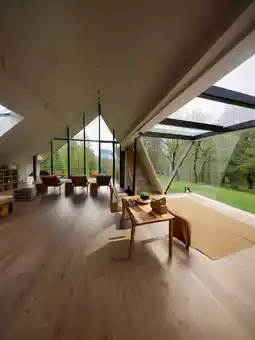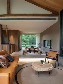 Wood-toned architecture surrounded by lush trees and emerald bamboo