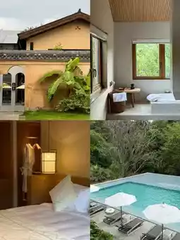 Pushing open the door, the fragrance of wood blends with the natural atmosphere outside the window. The interior design is unique, with a perfect blend of traditional and modern elements. Soft bedding and complete facilities provide the ultimate in comfort. The oversized floor-to-ceiling windows are like picture frames 🖼, framing the mountain scenery and stream scenery one by one.
