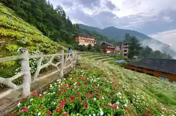 During the blooming season, looking down from above, you'll see a sea of pink and purple flowers, vibrant and bright, cascading down the terraced slopes. As the gentle breeze blows, the flowers dance like butterflies.