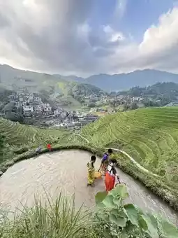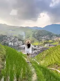 Morning mist dances through rice steps, evening lights on stilt houses resemble falling stars. The circular terrace offers god-tier photo spots with endless green waves~