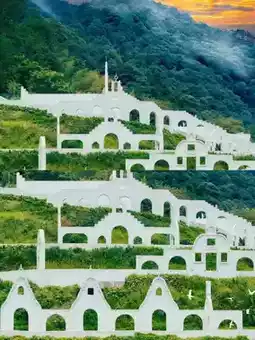 2⃣️City of Light: A sea of white castles and hydrangeas on the hillside, with white walls scattered on the hilltop, a cave like a hobbit house in the middle, and three infinity pools facing the valley and the sky.