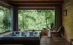 In the afternoon, retreating into the tea room of the guesthouse, time seems to be slowed down by the mountain breeze, flowing gently. Outside the window, the bamboo forest sways, bamboo leaves undulating like green waves, distant mountains like ink, silently resting between heaven and earth. Occasionally, bird calls pierce through the forest, crisp like the sound of a zither, adding a touch of liveliness to this tranquil space. Local wild tea unfolds in a purple clay teapot, the lingering tea fragrance carrying the crispness of the mountains and fields, filling the air. Taking a deep breath feels as if the entire lungs are cleansed by the freshness of the mountain air. The tea soup tastes slightly bitter at first, then quickly turns sweet like a spring, the flavors unfolding layer by layer on the tongue, as if savoring the richness of the entire autumn. The tea room is elegantly arranged, the solid wood tea table glowing with a warm luster, and delicate tea sets placed on a plain-colored tea mat, each piece exuding the warmth of craftsmanship. We slowly pour water and brew the tea, watching the leaves rise and fall in the cup, like the ups and downs of life, letting the autumn light flow slowly in the misty tea aroma. The tea smoke rises gently, blending with the bamboo shadows and mountain colors outside the window, and the mind feels as if washed by mountain spring water, becoming clear and peaceful. A pot of tea, half a day of leisure, the autumn in the mountains can be so leisurely "drunk" into the heart. Here, drinking tea is no longer just quenching thirst, but a practice in harmony with nature. In the fragrance of tea, time seems to take shape, flowing slowly and gently.