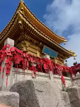 ➡️The three golden halls are respectively Jade Emperor Top (worshiping Jade Emperor), Liangbao Platform (worshiping God of Wealth), and Wumu Golden Hall (worshiping the Five Mothers of Heaven and Earth). The Jade Emperor's Top and Liangbao Platform are opposite and towering, the terrain is high, only one person can go up and down, the road section is not far, but the slope is steep and it takes a lot of physical effort. The Golden Hall is lower in terrain and can be reached by passing through the Moral Mansion. The three peaks stand together, each occupying one side. The three palaces are golden and solemn, like three mountain guards, marveling at the shock and magic of the building built in this desperate situation.