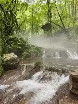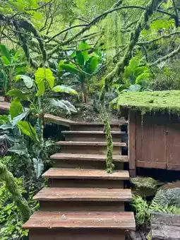 A dreamy little path with mist weaving through the dense bamboo forest! Lush greenery everywhere, like stepping into a fairy tale!