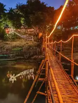Any foodie looking for a place to eat in Luang Prabang should go to Dyen Sabai Restaurant. You may enjoy a local Lao culinary experience while looking out over the Nam Kahn River. To reach there, you'll have to cross a shaky wooden bridge that costs $1.00 to cross. If you visit at night or during sunset, the bridge will be illuminated with fairy lights.