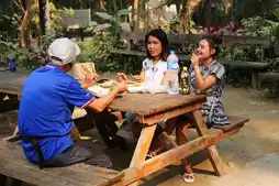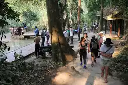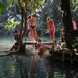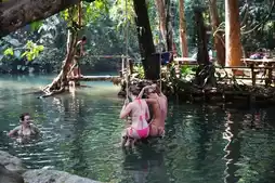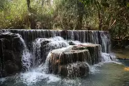 The only natural landscape I visited in Luang Prabang was the Kuang Si Waterfall . This is a limestone mineralized pool waterfall, similar to Jiuzhaigou and Huanglong in China, but with much lower degree of calcification. The ecological condition here is absolutely top-notch, and there are towering ancient trees with a breast diameter of more than 2 meters standing around you at any time. But what really sets Kuang Si Waterfall apart from domestic scenic spots is the freedom to swim and play in the waterfall! The dark and dense surrounding jungle, the light and shadow formed by the setting sun penetrating through the dense tree canopy, and the beautiful swimmers like water lilies, may accidentally capture photographic works like Botticelli's paintings "Spring" or "The Birth of Venus".