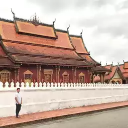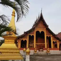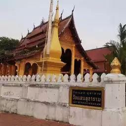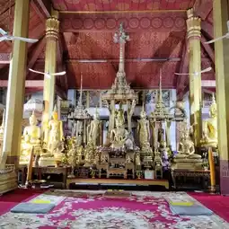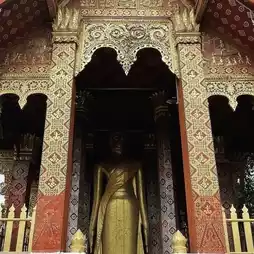 The highlight of Wat Saensukharam is the large standing Buddha statue, the only one in Luang Prabang, with beautiful, smooth hands and a replica of the Buddha's footprint on the side of the standing Buddha hall. The ordination hall is beautifully lacquered and gilded, in the style of central Luang Prabang, as can be seen from the octagonal pillars and lotus petal-shaped pillar spires. The interior walls of the ordination hall are decorated with gold paintings on a red background. In the center is the principal Buddha statue or Phra Ong Luang. This is an ancient temple built after Luang Prabang separated from Vientiane and was a different kingdom before that. There was an old temple in the area where Wat Saensukharam was built in the 15th century, making this temple quite beautiful and interesting.