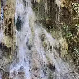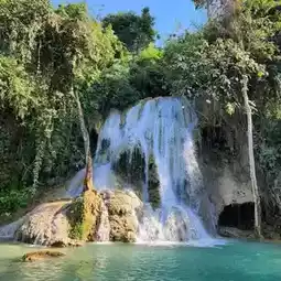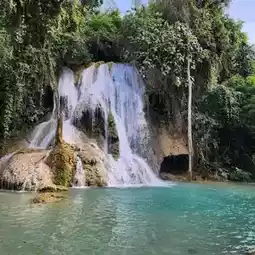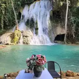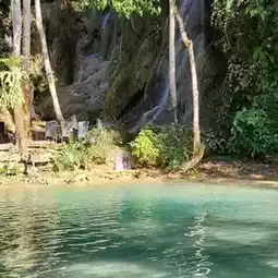 Here!! It is a limestone waterfall similar to Kuang Si Waterfall, but it is smaller and has a small area. It is a single-tiered waterfall. Most importantly, the water is clear and you can see the fish clearly. There is also a restaurant where you can sit and eat by the waterfall. The atmosphere is very good. The nature is very beautiful. I must say that... the atmosphere is great. The nature is truly beautiful.