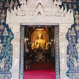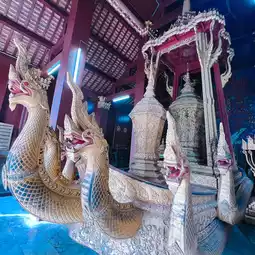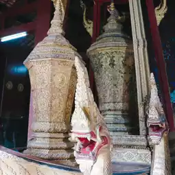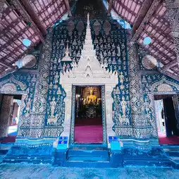 🌷🌸 Inside the Sim is the principal Buddha image or Phra Ong Luang, including a replica of Phra Bang, which is enshrined on the side. At the back of the Ubosot, there is stained glass that has been decorated to become a large Thong tree and animal figures in literature.