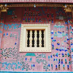 💐🙏 The Reclining Buddha Hall, the outer walls are painted in rose pink and decorated with beautiful stained glass patterns. Telling the story of a folktale with a moral teaching to remind people