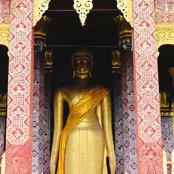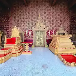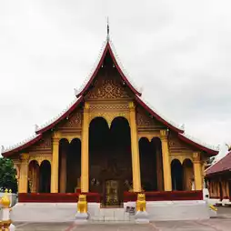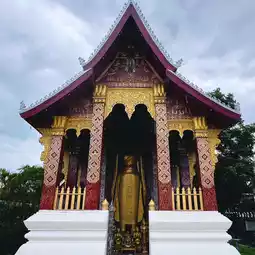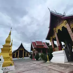 🍀🙏🌱 The sim is in the Vientiane style, which is tall, but the roof is layered like the sim of Luang Prabang and has an additional roof in the middle like the sim of Xieng Kwang. The octagonal pillars and lotus petal-shaped pillar tops are decorated with gold patterns on a red background and a large standing Buddha statue, the only one in Luang Prabang.
