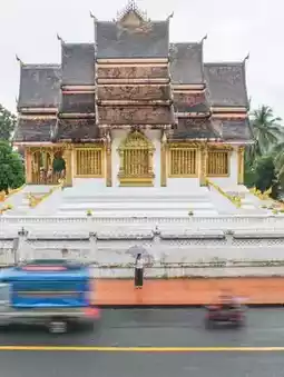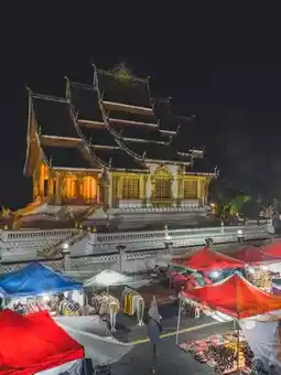 The Royal Palace of Luang Prabang is an ancient palace with a prominent check-in spot called 'Golden Hall'. It is 120 years old and was built as a symbol of the relationship between Laos and France before Luang Prabang became a French colony. Another part is 'Hor Pha Bang', located within the Luang Prabang National Museum. It was once an old palace built during the reign of King Sisavang Vong. The building is a single-story structure elevated in French style, with a Lao-style roof. It beautifully combines colonial and Lan Xang art. Inside, various rooms display the belongings of the kings, and you can enjoy the intricate interior design. Photography is not allowed inside. In the evening, there is a walking street in this area for you to stroll around.