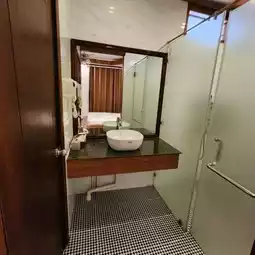 For the bathroom, whether it's a room for 2 or 3 people, the hotel designed it the same way. It is divided into 3 zones: the sink zone is in the middle between the shower room and the toilet, the shower zone is on the right, and the toilet zone is on the left. We think it's great because it's convenient to use. 🤣🤣 The room is spacious and clean, with complete amenities. After checking in and packing our bags, it's time to take the elderly on a tour.