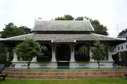The lobby and the hotel's only restaurant are integrated together, resembling the kind of house of a wealthy Nanyang family that only appears in the movie "Crazy Rich Asians". Tropical ferns hang from the eaves, and large patterned earthenware vases hold birds of paradise and monsteras.