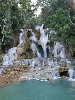 Kuang Si Falls, also known as "Golden Deer Falls," is located 29 km from the ancient city of Laos. It is a magnificent natural wonder. Although it is not as grand as Niagara Falls, the world's largest waterfall, or as tall as China's Huangguoshu Waterfall, it attracts tourists from all over the world with its unique charm.