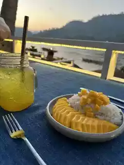 I ordered mango sticky rice and Luang Prabang sausage, with a drink each.