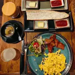 As I stepped inside, I couldn't help but notice the lively atmosphere, with people chatting and savoring their morning treats. I decided to indulge in their breakfast set, which cost 110,000 kips. It was a culinary delight! The set included a perfectly crusty bread, crispy bacon, fluffy scrambled eggs, a fresh salad, invigorating coffee, and zesty lemon juice. Each bite was a testament to the cafe's dedication to quality and flavor.