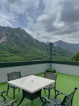 The open-air rooftop provides breathtaking views of the old town and the sky, making it a perfect spot to watch the sunset.