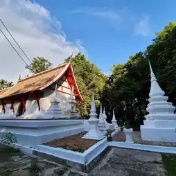 The Luang Prabang style sim has two sections of almost equal size that are set on a low platform. The rear and older half is the sim proper and dates from the 18th century. It has some pleasant and sometimes vibrant interior jataka murals depicting the various lives of the Buddha.