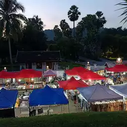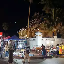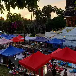 🌼Luang Prabang Night Market or Khao Niew Street is the closure of Sisavangvong Road, the road next to the Luang Prabang National Museum and Phousi Mountain, transforming it into a market similar to a Thai walking street. It starts from 5:00 PM to 9:00 PM.