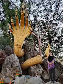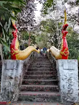 Sixth stop: Mount Phousi, the highest point in the city and a must-see attraction for every tourist. It is more than 100 meters above sea level, with 328 steps. You can climb to the top while enjoying the fresh air and admiring the mysterious Buddha statues in various postures along the way. I have a little question: why are there dragon sculptures in Buddhist temples? I scanned them with my eyes and found that they were all odd numbers. It turns out that dragons are very spiritual creatures in Buddhism. Buddhist scriptures divide them into four categories: heavenly dragons, empty dragons, sea dragons, and land dragons, and each number has a different explanation. When you reach the top of the mountain, you can overlook the entire ancient city and enjoy the beautiful scenery! When I arrived at the sunset viewing point, it was just the moment when the sun was setting. Unfortunately, there were too many people, and I didn't capture the wonderful moment.
