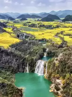 There are ten waterfalls densely distributed within a short area of four kilometers, the largest of which is the Shenlong Waterfall with a drop of 56 meters. The waterfall and the surrounding rapeseed fields complement each other, forming a magnificent pastoral scenery.