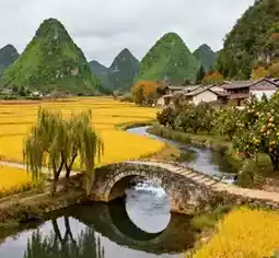 October in Qujing, the autumn colors are at their peak. This small city in eastern Yunnan weaves a pastoral dream far from the hustle and bustle with golden rice fields and clear waters beneath green peaks.