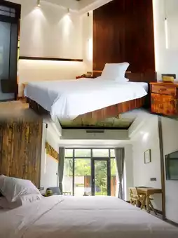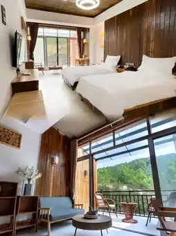 When you step into the B&B, it's like walking into a green world🌿. The B&B is located halfway up the mountain, hidden in the forest, surrounded by green mountains and trees, and the air is so fresh that it is intoxicating. It is definitely a natural oxygen bar🫧. The independent mountain top makes the view particularly open. Here, you can enjoy the sea of clouds and mountains during the day☁️, the starry sky and the moon at night🌕, and watch the sunrise and sunset🌄. Every moment is as beautiful as a painting. The lobby and tea room have large floor-to-ceiling windows🪟, and the rooms also have large terraces, which are well-lit. Whether indoors or outdoors, you can enjoy the beautiful mountain view⛰.