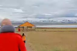 Walking along the lake in the snow, the ground crunches underfoot. The prayer flags by the lakeside, dampened by the snow, appear even more vivid in color—red, yellow, blue, and green—fluttering vigorously in the wind and snow, as if trying to break free and soar away. Occasionally, a herdsman passes by on horseback, the horse's hooves leaving no trace in the snow. Both man and beast remain silent, with only the jingling of bells heard, approaching from afar, then receding into the snowy curtain.