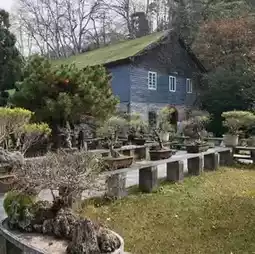 The lake is in the shape of a lute and a zig zag bridge connect to an oval shaped island in the middle of the lake.