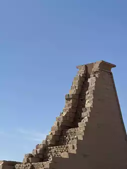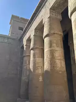 Pylon of Ramses III: Unfinished reliefs show Libyan wars • Touch left tower—original mudbrick under stone skin.