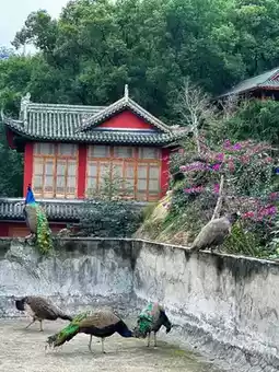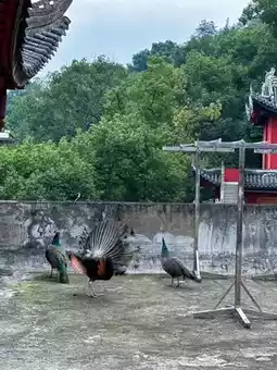 On the third-floor terrace, you can also see several beautiful peacocks walking leisurely. These peacocks have colorful feathers and elegant postures, becoming the darlings of the camera.