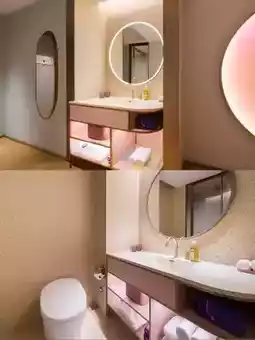 The guest rooms are labeled as 28 square meters. The space is not large, but it doesn't feel cramped. The provided water and tea are quite good. The bathroom is not big, with the sink outside, an automatic toilet, and convenient operation of the shower, lights, and air conditioning.