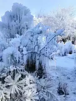 When the winter snow quietly falls, the rime all over the mountains is like a silver-clad spectacle, and the crystal-clear ice and snow corals bloom on the branches, as if perfectly blending the tranquility of winter with the vitality of spring, embodying a spring dream in winter.