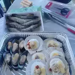 The seafood includes bouncy shrimp🦐 and garlic half-shell scallops