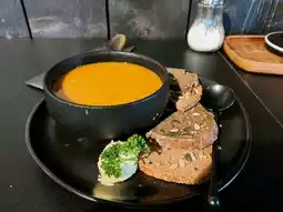 This is the soup of the day served with bread. The day we went was a Moroccan-style soup with a well-rounded taste. Lightly fragrant with spices, very delicious